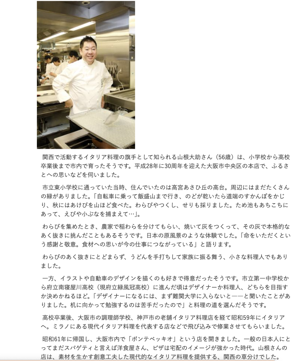 イタリア料理店「ポンテベッキオ」のオーナーシェフ・山根大助さんは寝屋川出身のようです。