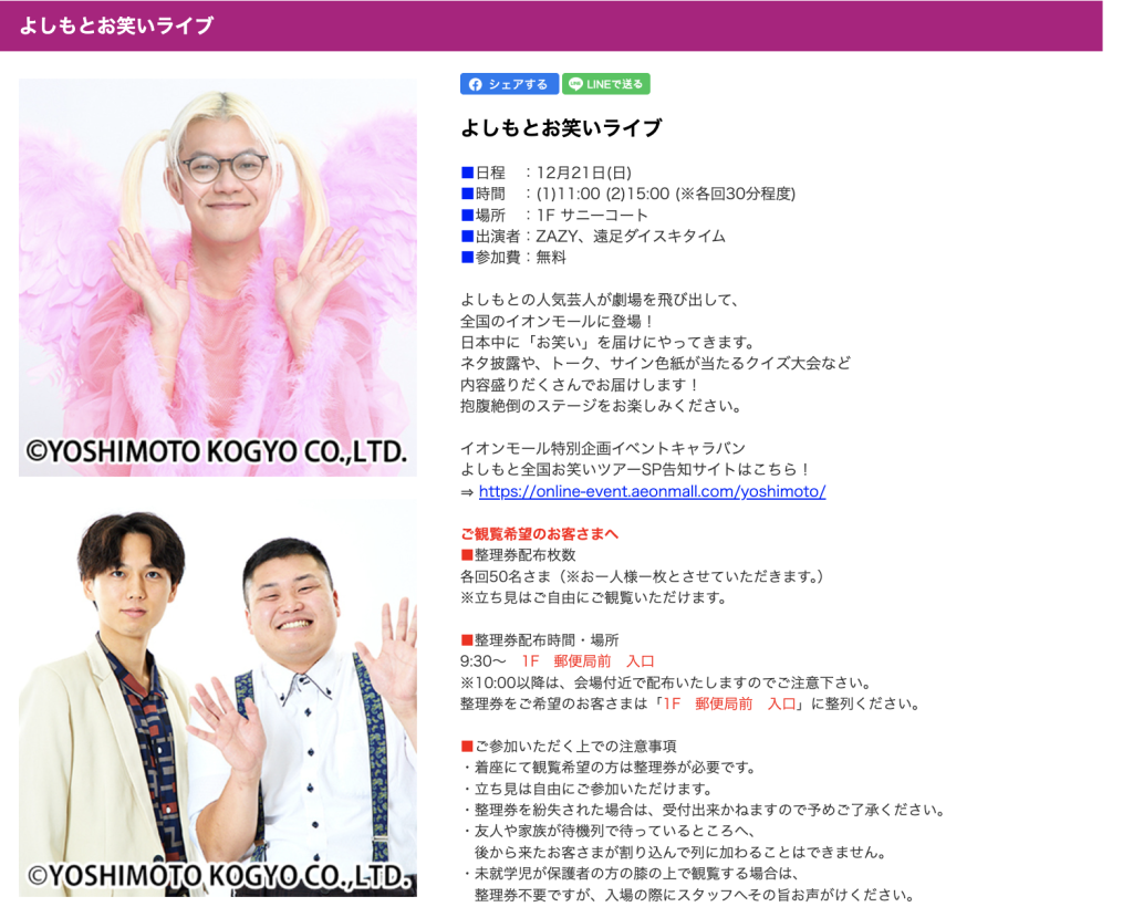 ネタ披露やトーク、サイン色紙が当たるクイズ大会などもあるそうですよ。ショッピングと一緒にお笑いを楽しむのもいいのでは!