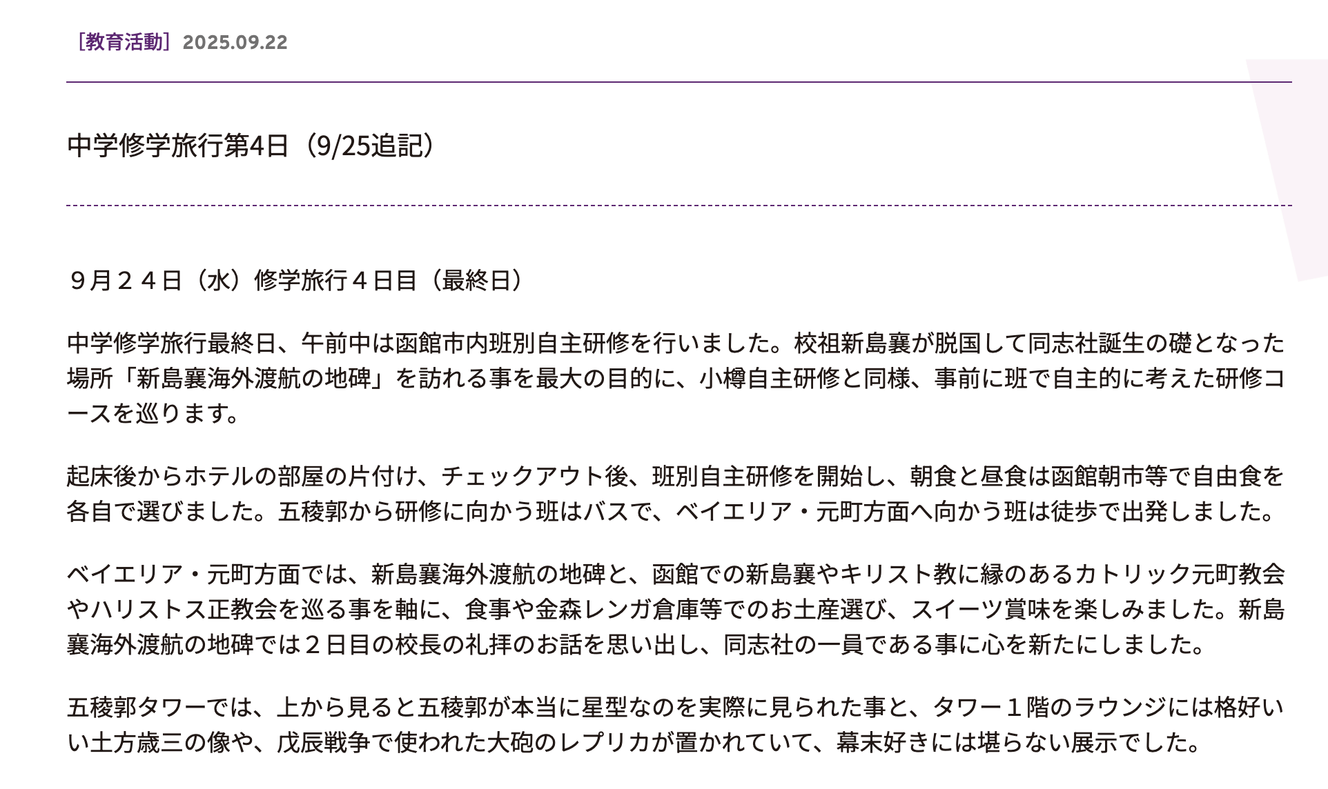 4日目は函館市内の班別自主研修で、「新島襄海外渡航の地碑」や「カトリック元町教会」、「五稜郭」などを巡り、グルメを楽しんだとのこと。