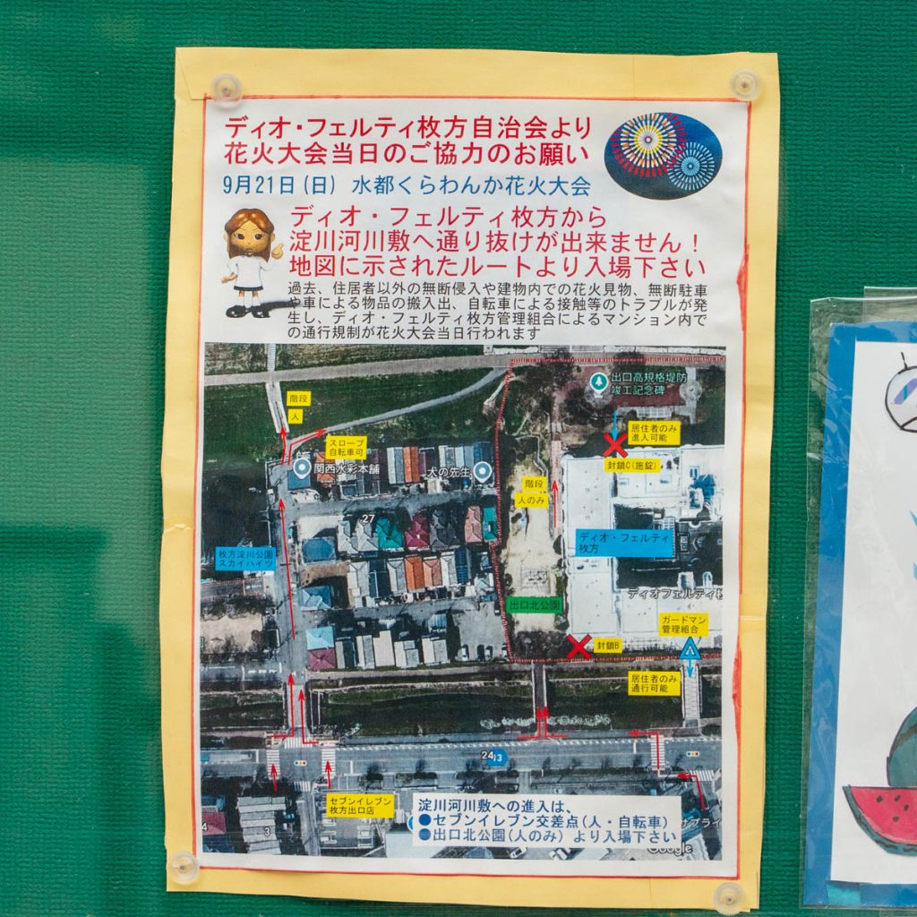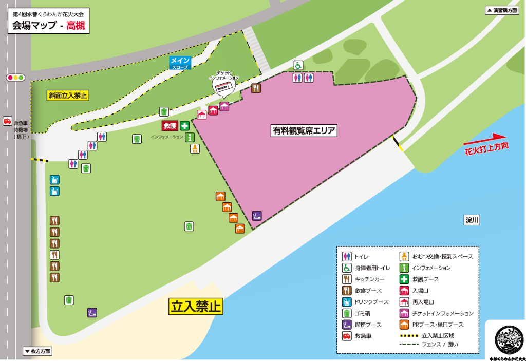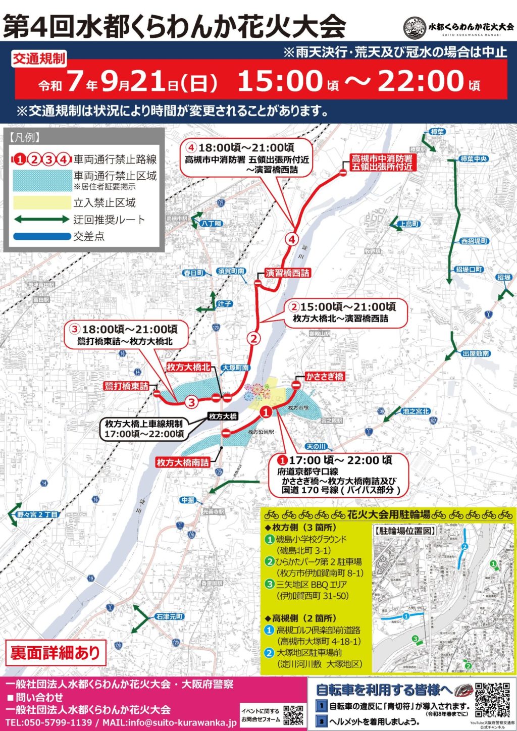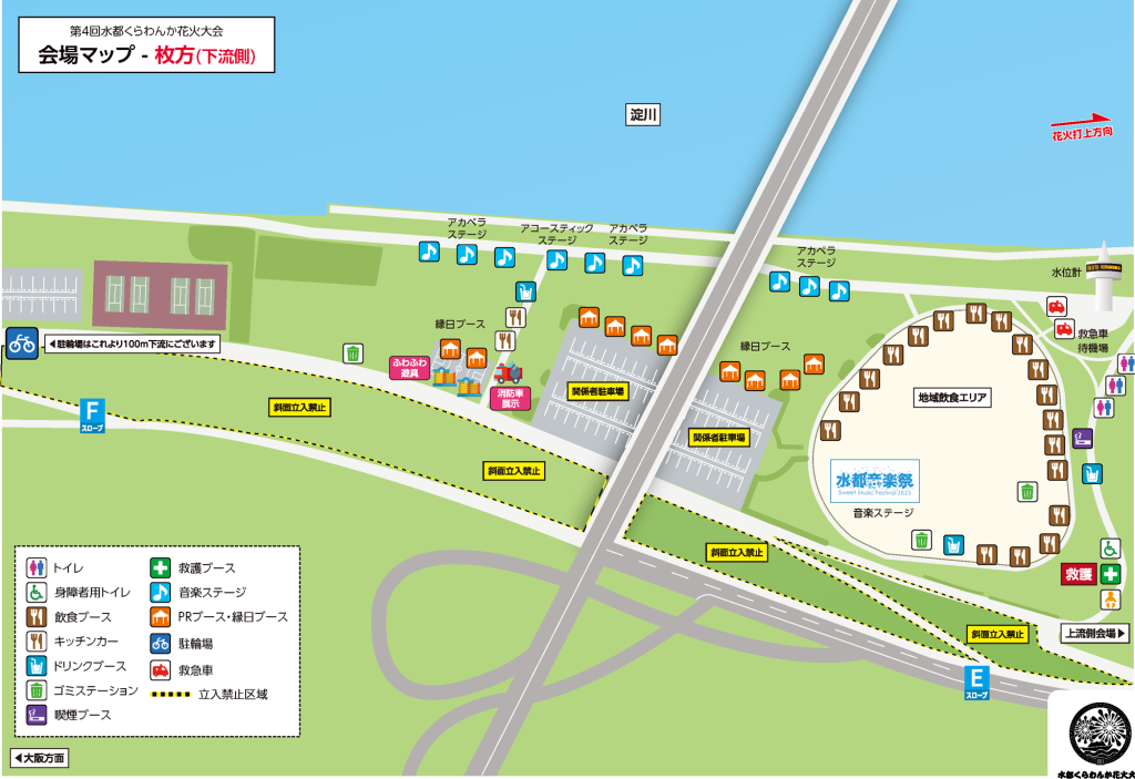 第2駐車場は「くらわんか花火大会観覧者用駐輪場」として終日使用するため、前日の18:00以降は駐車場としての利用不可。
