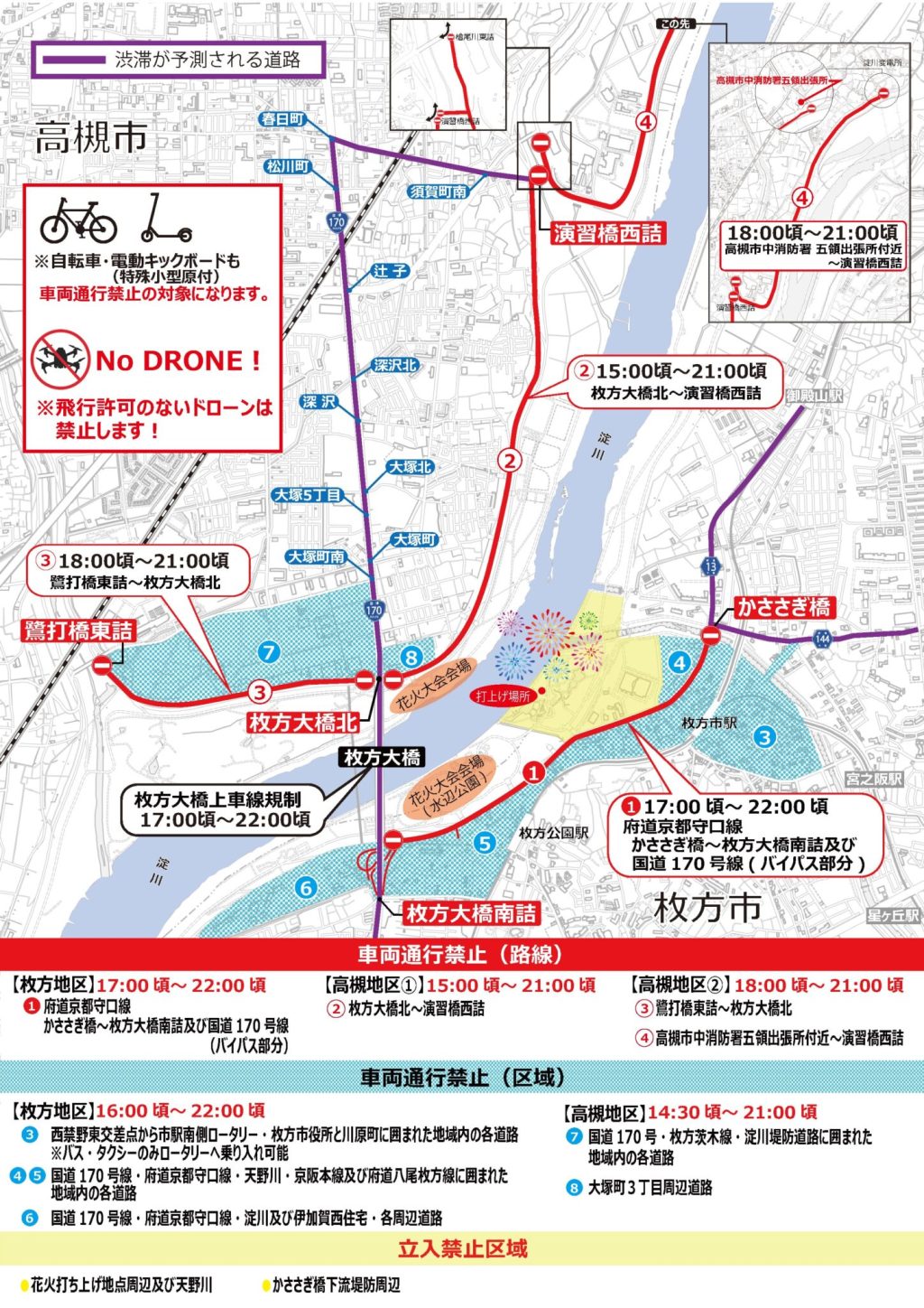 ・JR高槻駅又は阪急高槻市駅より交通規制前は京阪バス「枚方大橋北詰」、規制後は京阪バス「大塚」で降車