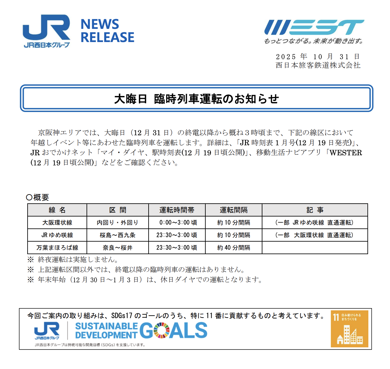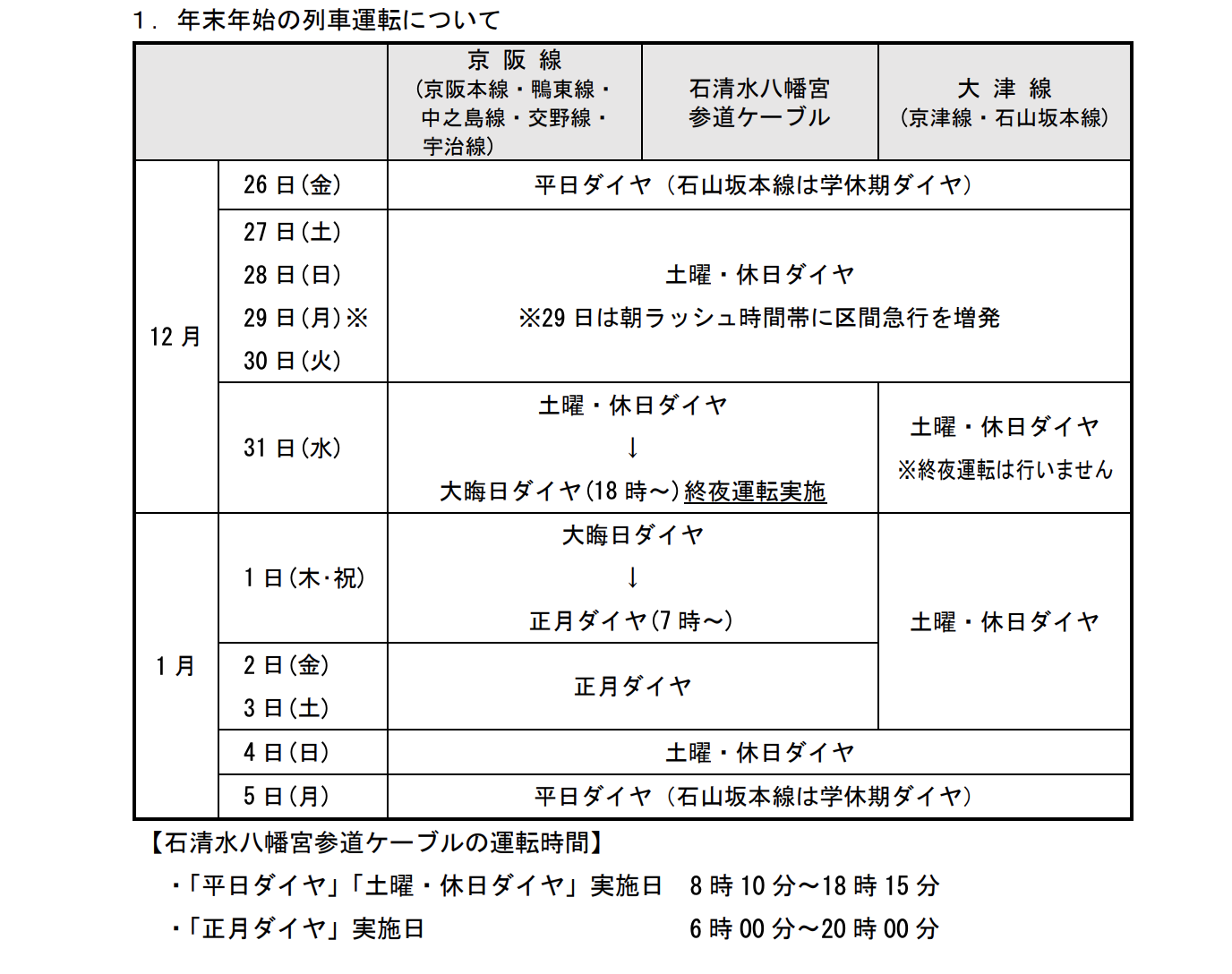 電車やバスの年末年始ダイヤ情報をまとめました。