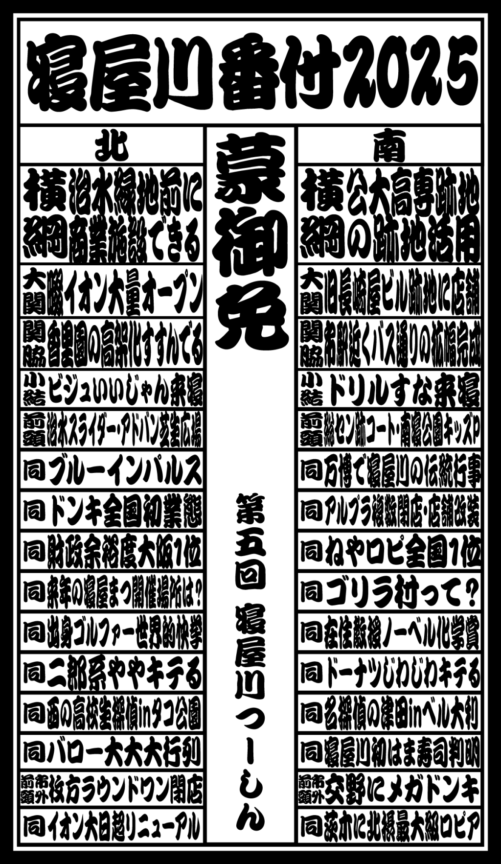 寝屋川つーしんでは某経済紙に影響された企画「北の横綱・南の横綱 寝屋川番付」を毎年お届けしておりまして、この記事はその2025年バージョンとなっております。今年で5回目。