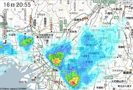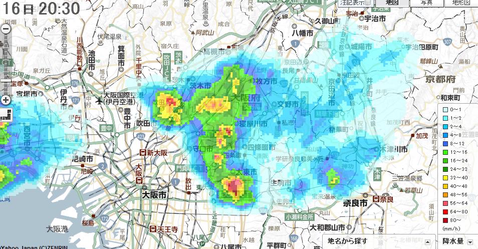 このレーダー画像の様子は一部の方がTwitter上で話題にされていました(当サイトでも紹介してみようと思います)が、その時は寝屋川市内がもっと赤かかったです。