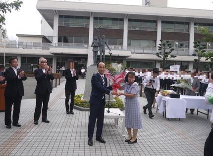 はじめに職員や関係団体などからたくさんの花束が贈呈されました。