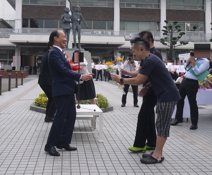 一般の市民からも花が贈られます。(本人がTwitterで告知していたのもあってか、昨日の退庁式よりも観覧する一般市民の数が多かったです。)
