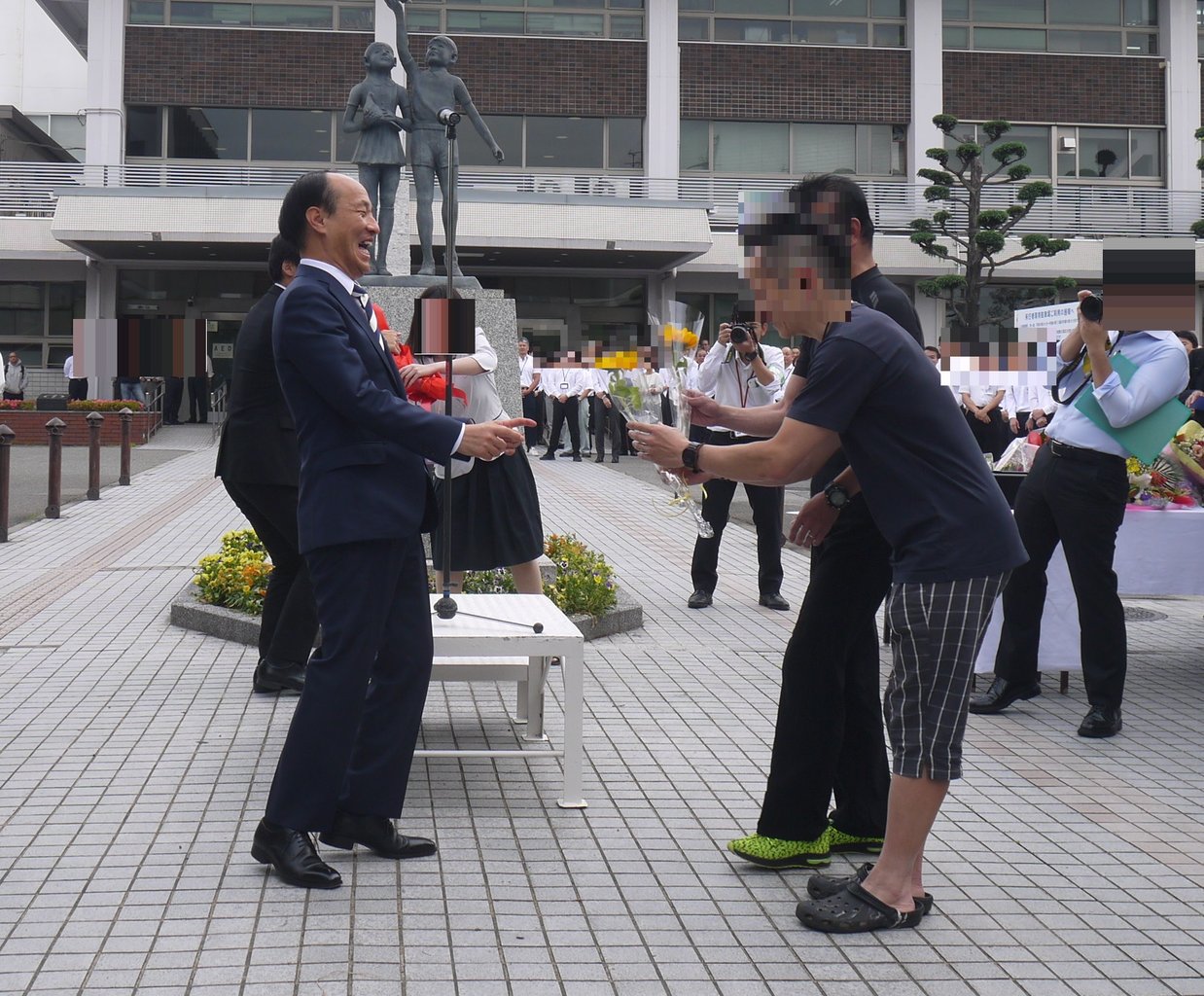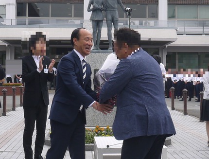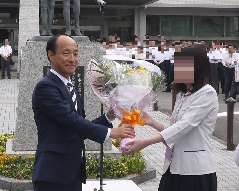 当日は市役所本庁舎の玄関前で初登庁式が行われ、たくさんの職員らに出迎えられました。