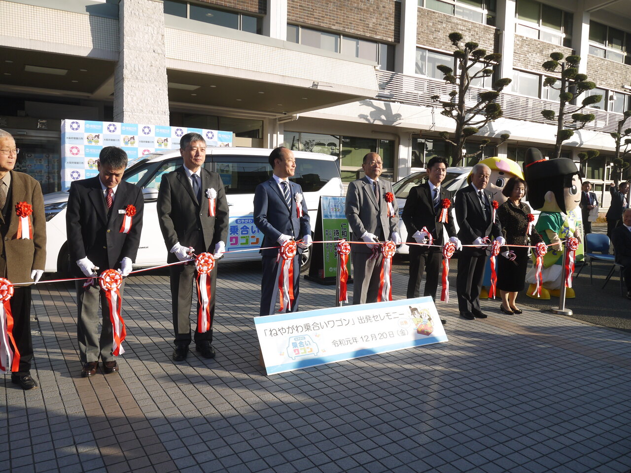 急な坂や狭い道が多い3地区で実験運行が始まるのを記念して、午前8時20分から寝屋川市役所本庁舎正面入口前で出発式が行われました。