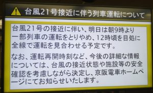 ・京阪とJR西が台風21号の接近による予告運休を発表(2018年9月3日)