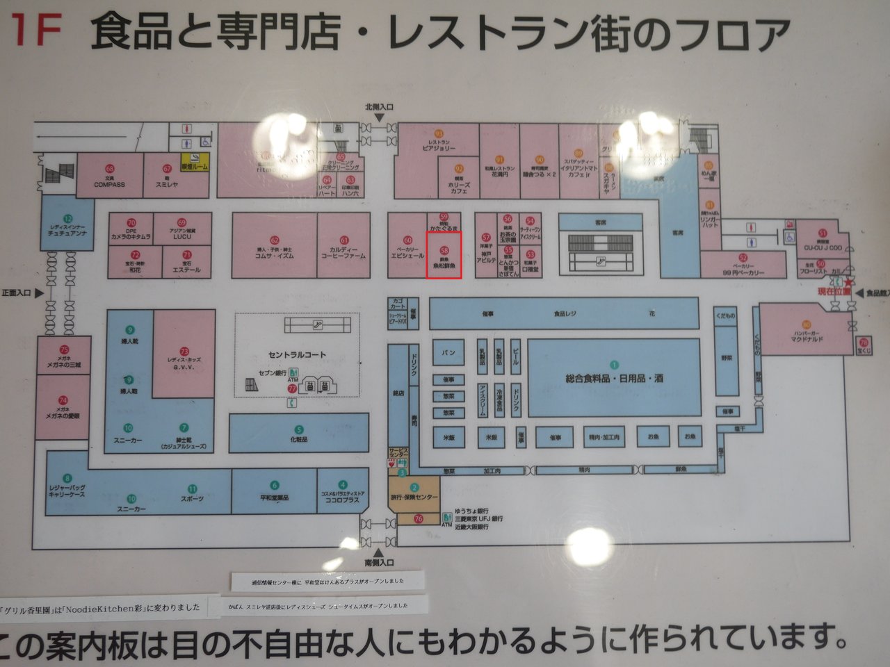 場所は1階の食品と専門店街・レストラン街のフロアで、各入口から入って真ん中ぐらいまで来たところです。
