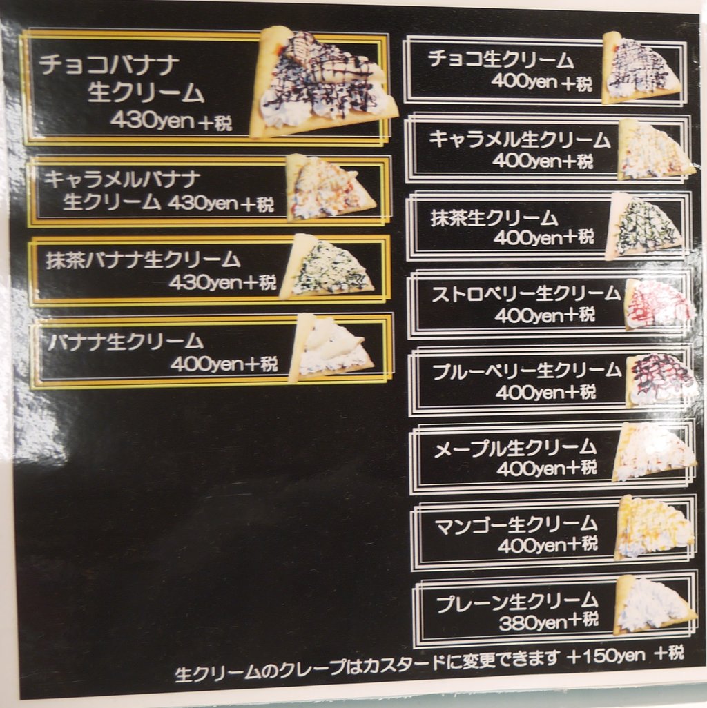 更に生クリームのクレープは+150円(税別)でカスタードに変更すると、違った味が楽しめるようです。