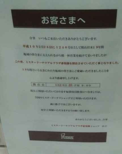 アルプラザ香里園のミスタードーナツが1/20(日)の閉店を発表。アルプラの開業当初から約20年間営業しているお店