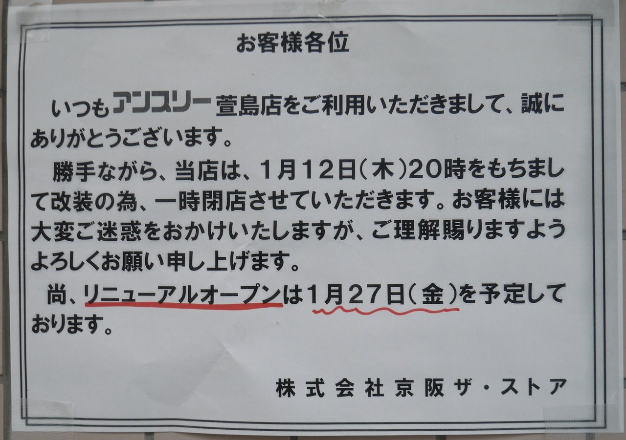 休業期間中は不便になりますが、リニューアルオープン後のアンスリーに期待したいものです。