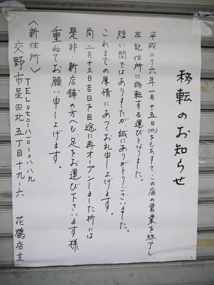 シャッターに移転のお知らせが貼られています。この場所での営業は1月15日まででしたが、2月の中旬に星田でまた再オープンするようです。
