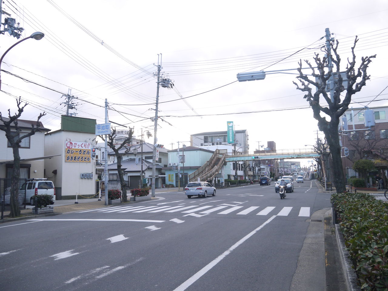 前の道路を西方向に行くと、すぐそこにある京阪電車の高架橋をくぐり、市役所方面です。