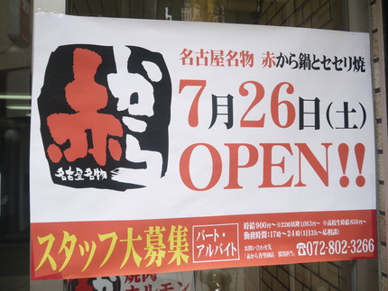 1階部分にあるビルの入口に、「名古屋名物の「赤から鍋とセセリ焼」のお店が7月26日(土)に開店する予定」として、貼り紙が出ていました。
