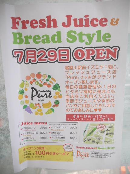 寝屋川市駅前のイズミヤと三菱東京UFJ銀行との間に、ジュース販売店の「Pure」(ぴゅあ)が開店するみたいです。