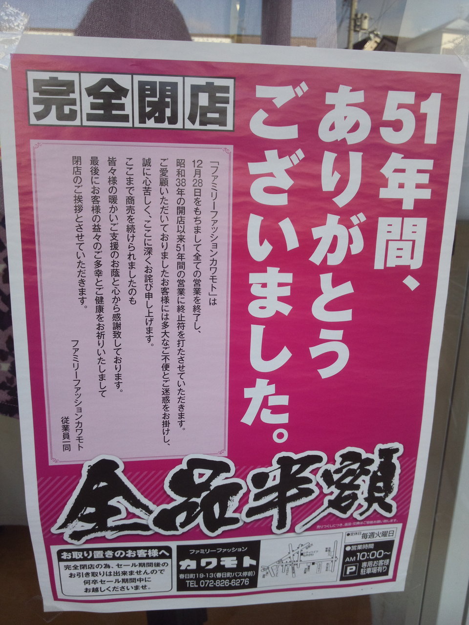 春日町(寝屋川市西部)にある衣料品店「ファミリーファッション カワモト」が、12月28日に閉店することが分かりました。