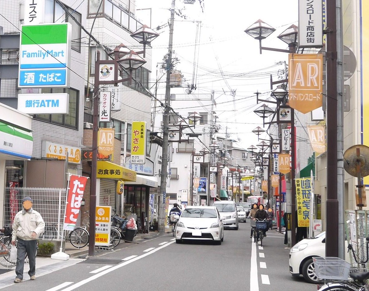 西方向へ行くと、すぐそこにファミリーマートやcafe de camoiがあって、そのまままっすぐ行くと寝屋川市駅へ向かいます。