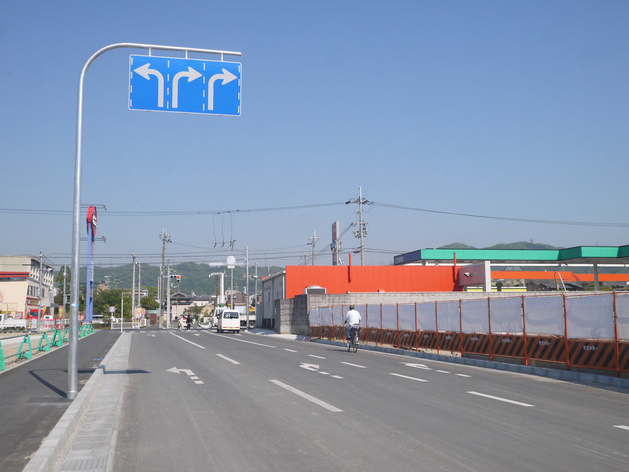 一方で、入口は寝屋川市街方面(北側)からの右折が禁止され、四條畷方面からのみ入れます。左折レーンが完成していました。