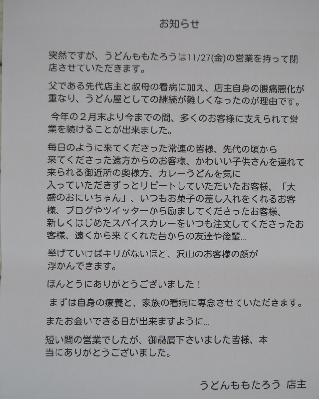 店主の方によると、閉店の理由は自身の療養と家族の看病に専念するためだそうです。