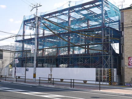 初町(寝屋川市中央部)で建設中の新しい枚方信用金庫寝屋川支店で、建物の鉄骨が姿を見せてきました。