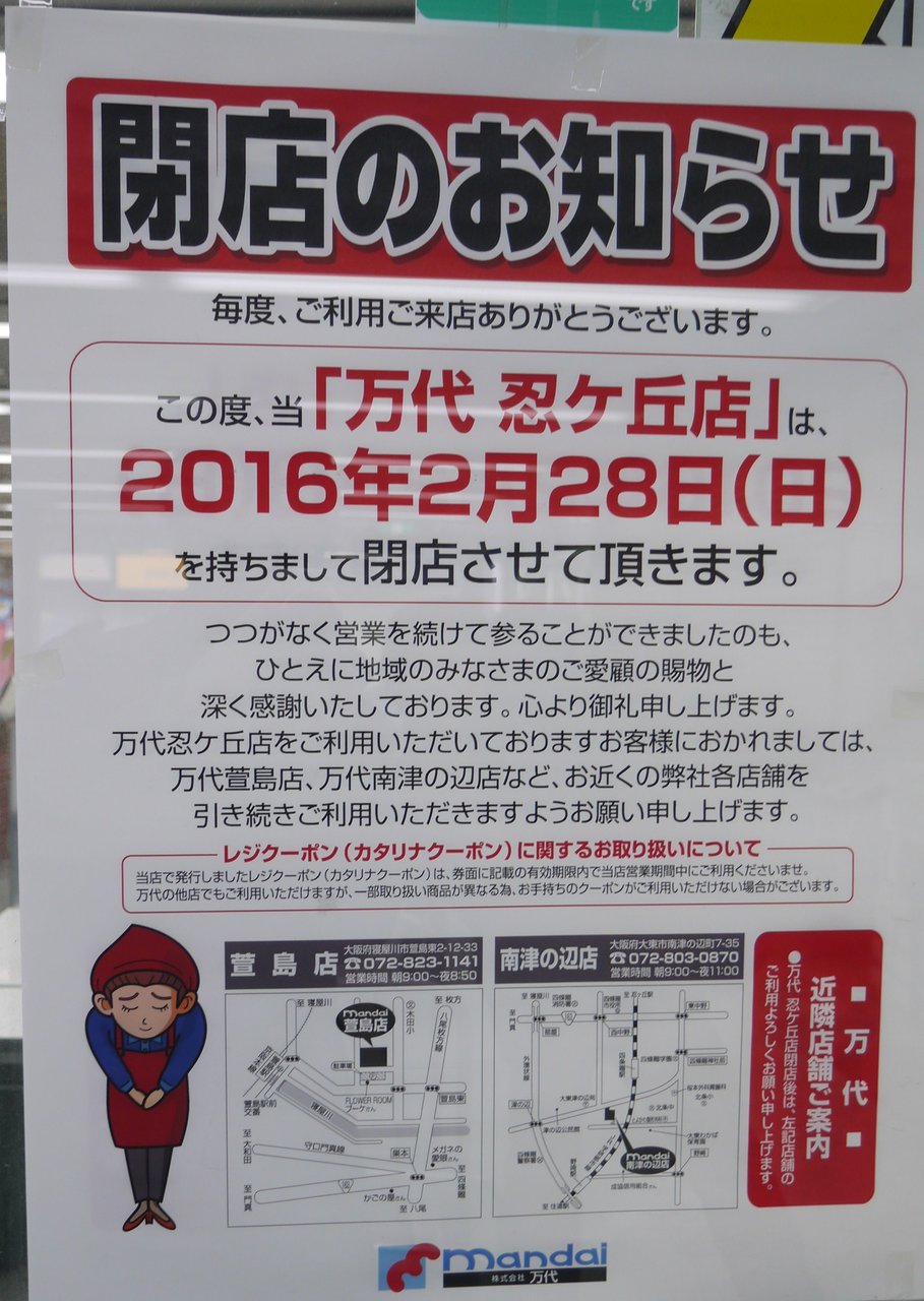 四條畷市岡山1丁目にあるスーパー「万代 忍ヶ丘店」が2月28日の営業をもって閉店することが分かりました。