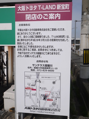 仁和寺本町3丁目(寝屋川市西部)の府道13号京都守口線沿いにあった「大阪トヨタ T-LAND新宝町」が、3月31日の営業をもって閉店していました。