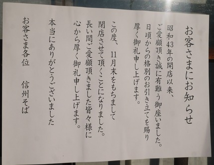 約半世紀にわたって信州そばやうどんを扱ってきましたが、諸般の事情で閉店することになったようです。