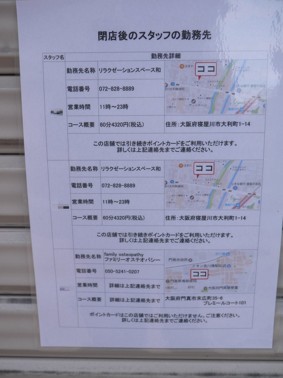これまで通り施術してもらいたいという方は、大利にあるリラクゼーションスペース和などに行けば良いみたいです。