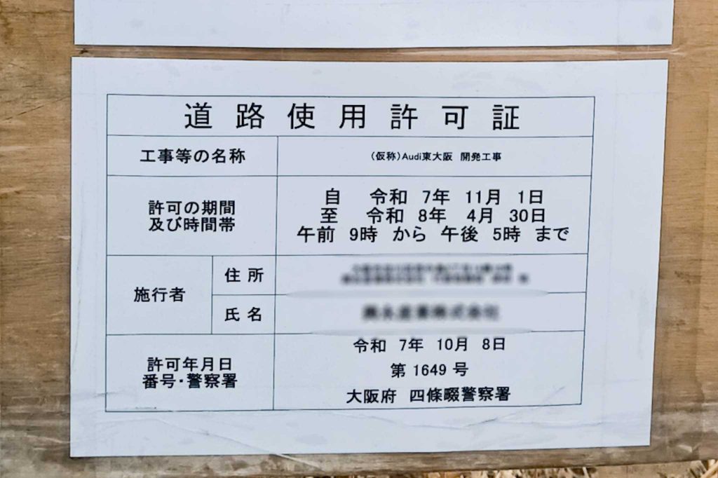 前回見に行った時には、気が付かなかったのですが、情報提供を頂いたので見に行くと「道路使用許可証」の工事等の名称の欄に『(仮称)Audi東大阪 開発工事』と書いてあるのを発見しました。
