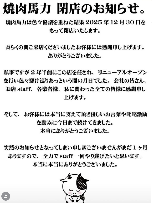 萱島駅近くの「焼肉馬力」が閉店しています。