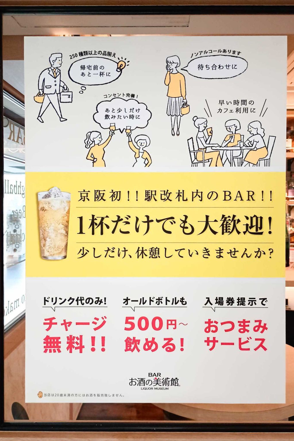 「お酒の美術館」(→公式サイト)は寝屋川市駅の改札内にあるBAR。全国に100店舗以上あるお店で、近くだと樟葉・京橋に店舗があるようです。