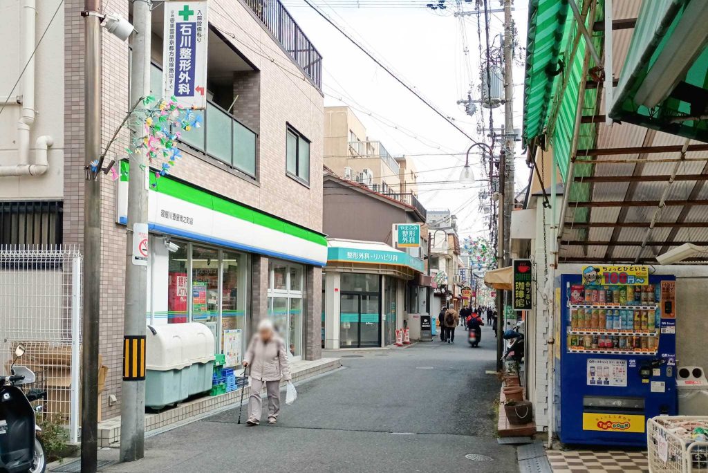 香里ダイエー本通商店街にあるファミリーマートです。こっちに行くと、ミーコのカステラなどがある方向。
