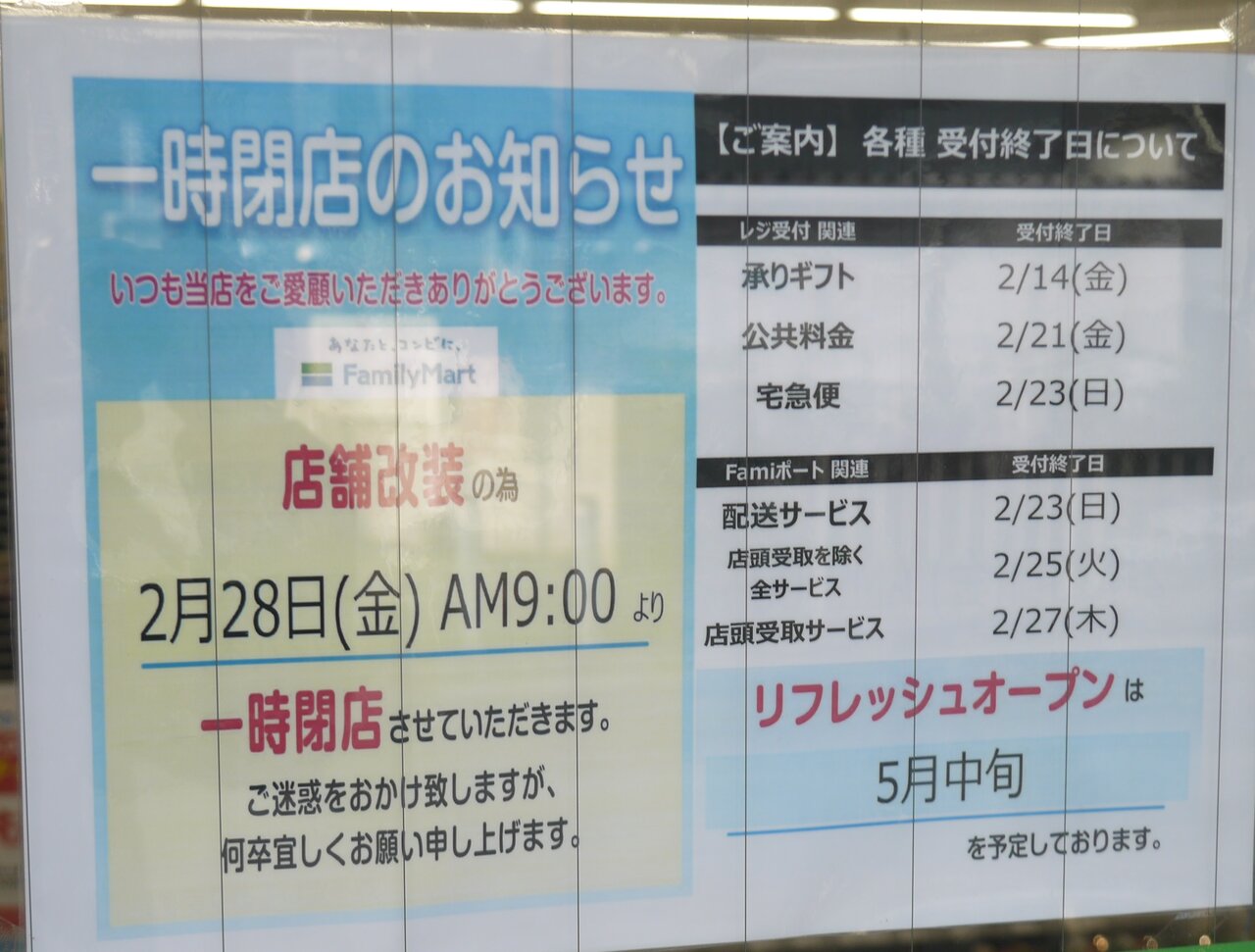 コンビニの「ファミリーマート萱島駅前店」(萱島信和町)が2月28日(金)午前9時から一時閉店すると発表しました。