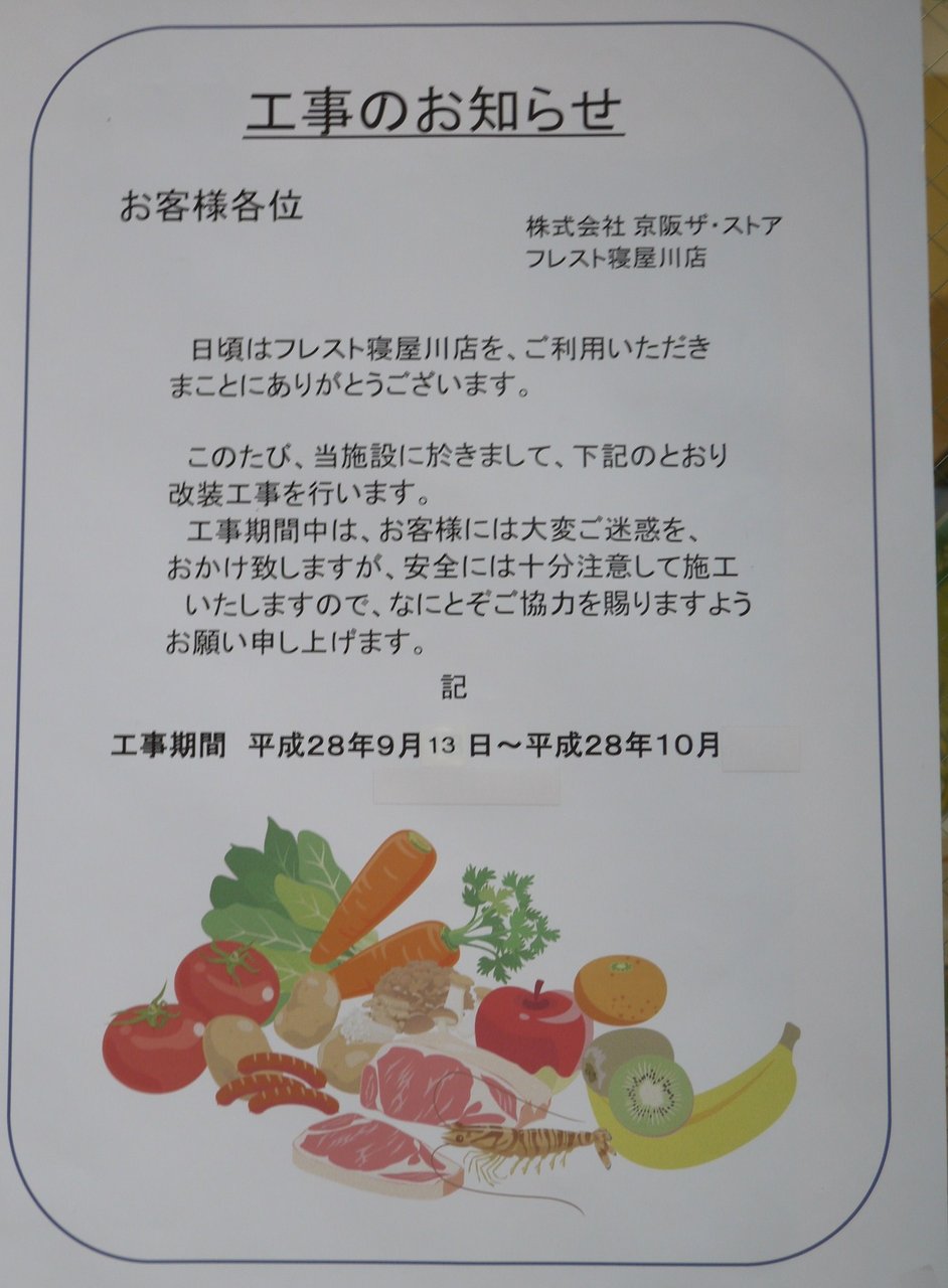 寝屋川市駅高架下にあるスーパー「フレスト寝屋川店」で改装工事が行われています。