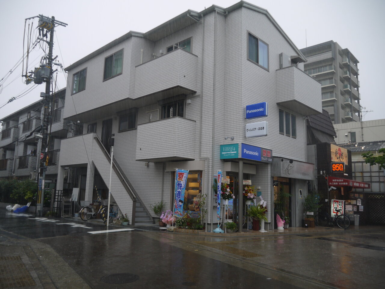 1階に入居しているお店は、左が初町の仮店舗に移転して営業していたパナソニック系家電販売店「ヴィレジア・ふるき」(古木電器商会)。右側が新しく入居した美容院「Aoi」です。