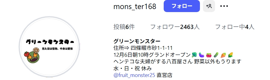 イオンモール四條畷近く『フルーツモンスター』の隣に作っていた青果店「グリーンモンスター」がオープンしています。