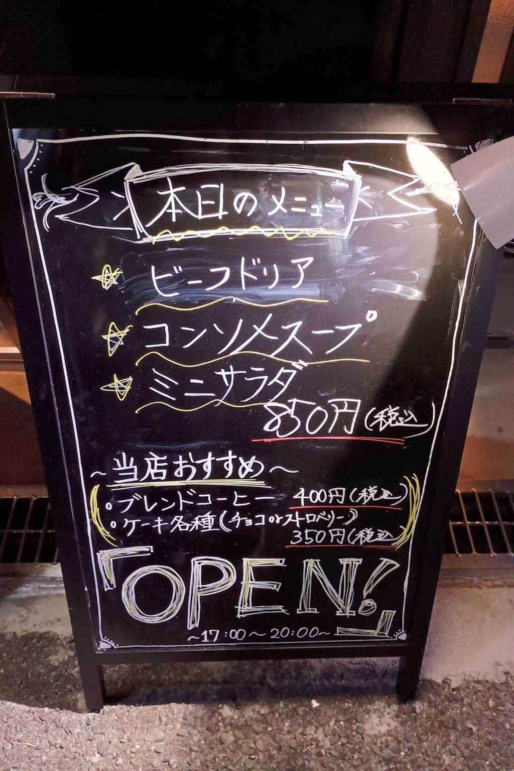 見に行った日のメニューは、ビーフドリアだったみたい。美味しそう。コーヒーやケーキも楽しめるそうで、夜カフェにいいですね~。