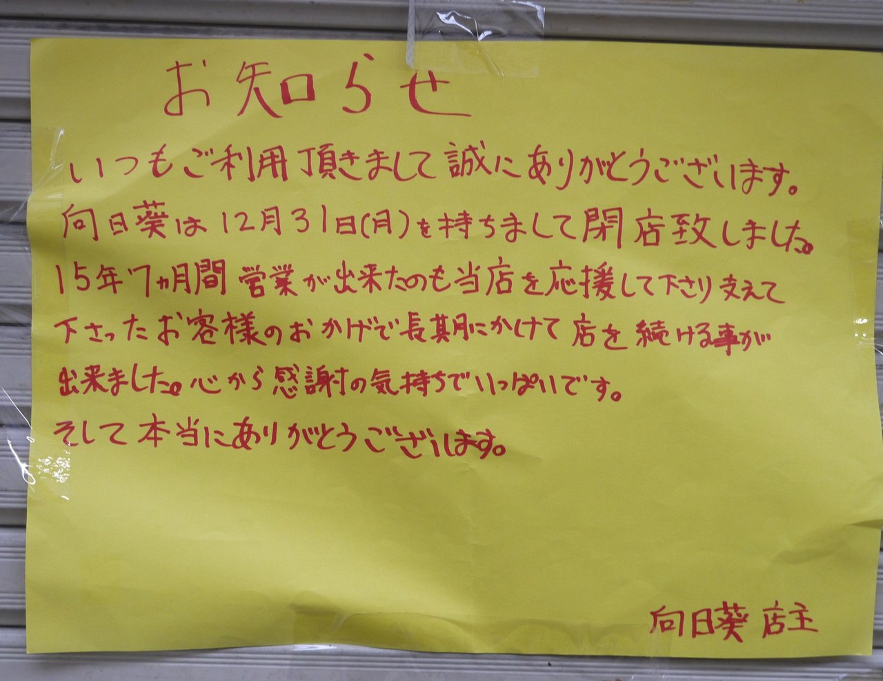 ベル大利商店街の「向日葵」が12月末の営業をもって閉店したみたいです。