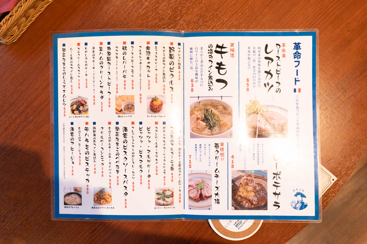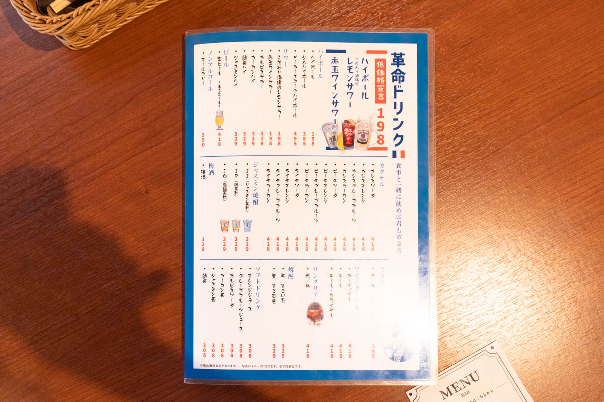 メニュー。革命ドリンクは198円!革命的な安さ!