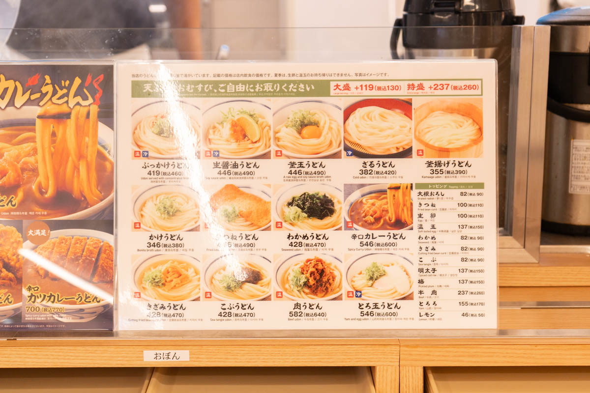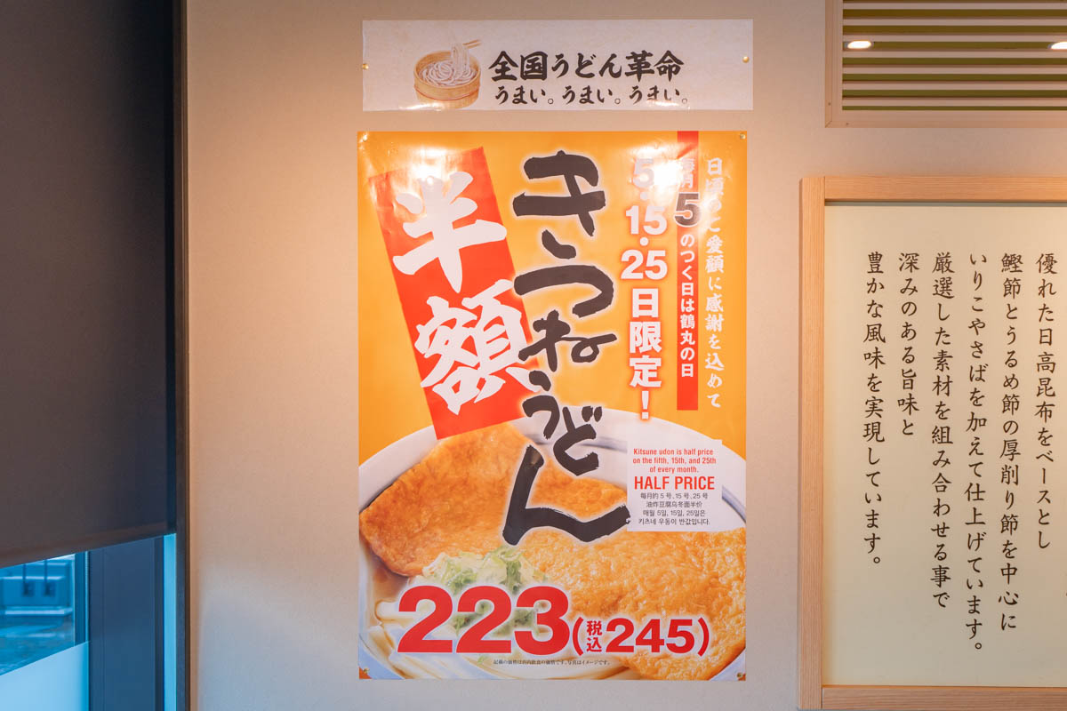 メニューなど。毎月5の付く日はきつねうどんが半額になるそうです。安すぎる!