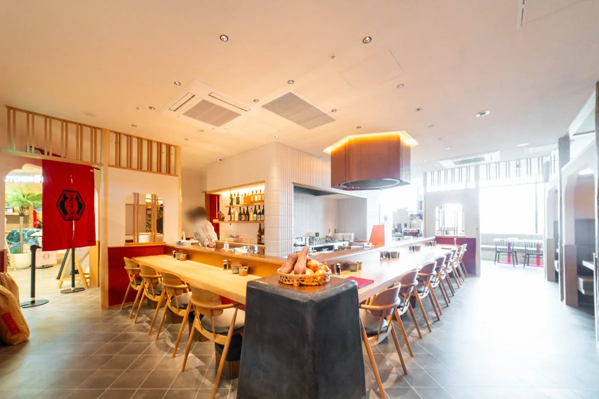 店内。1人で食べたり横並びで食べられるカウンター席や、奥にはテーブル席もありました。照明や店内に描かれたイラストも可愛くておしゃれ。