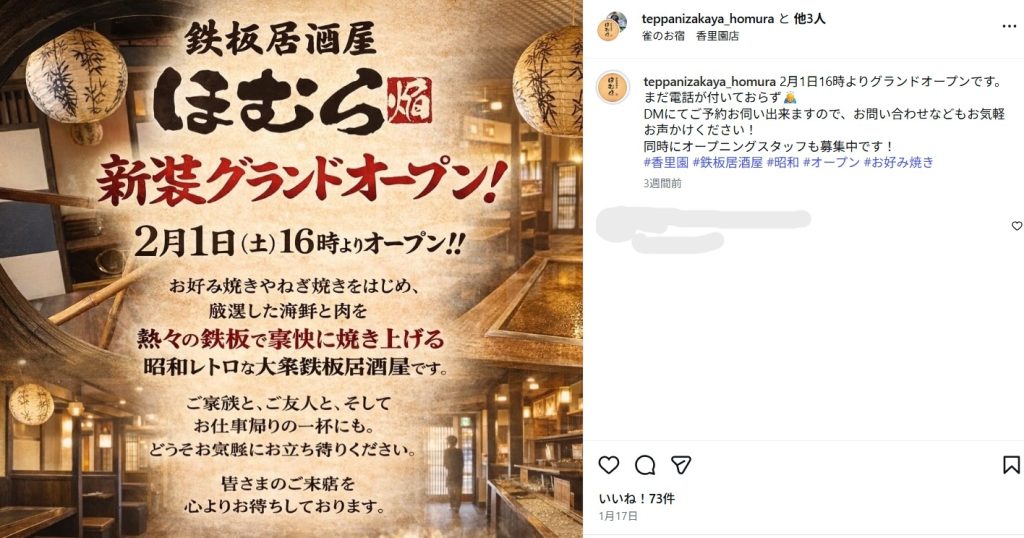 香里南之町に作っていた「鉄板居酒屋 焔(ほむら)」がオープンしています。