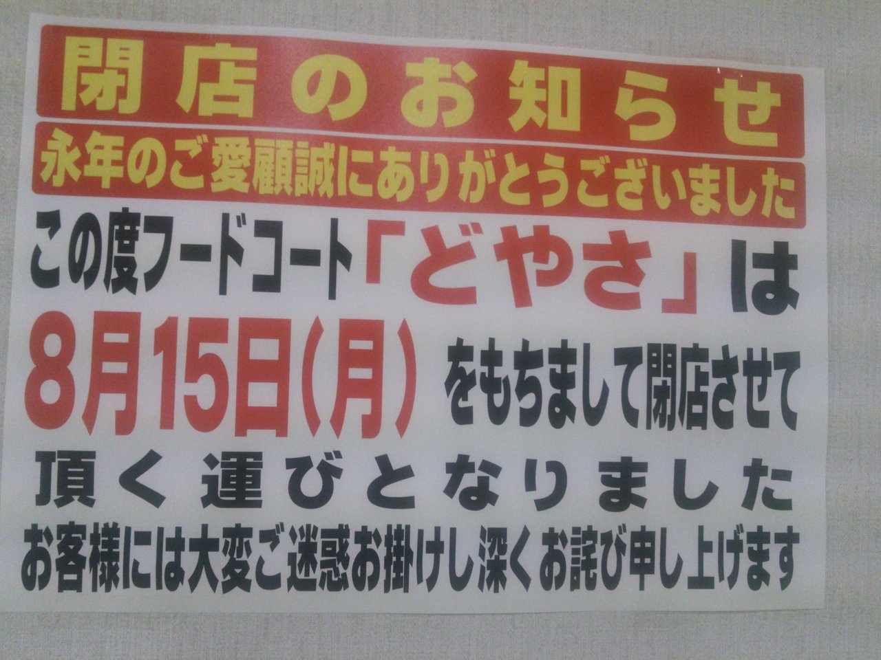 イズミヤ東寝屋川店にあったたこ焼き屋「どやさ」が8月15日の営業をもって閉店していることが分かりました。