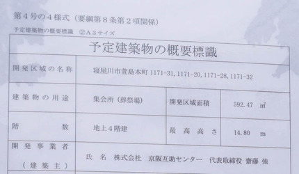 それによると、この場所にできるのは集会場(葬祭場)で、開発事業者は玉泉院(寝屋川玉泉院など)、守口シティホール、メイプルホール(寝屋川公園など)、メイプルホールファミリー(寝屋川東など)などを展開する「京阪互助センター」(本社:大阪市北区、公式ホームページ)です。