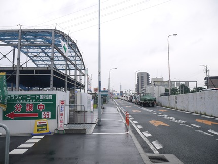 工事現場は国道170号線(外環状線)沿いのボウルバロン(2015年に閉鎖)の跡地で、ちょうどボウリング場があった辺りに地上3階建ての鉄骨が姿を現してきました。(裏側は22戸の住宅地「セラフィーコート国松町」として造成されました。)