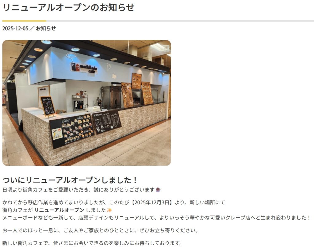 アル・プラザ香里園の「街角カフェ」がリニューアルオープンしています。