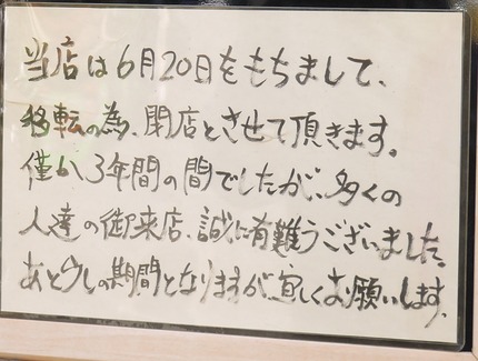 現地のお知らせによると、この場所では3年前から営業していましたが、移転のため閉店することになったようです。(6月25日現在、お店の看板やこのお知らせは現存せず。)