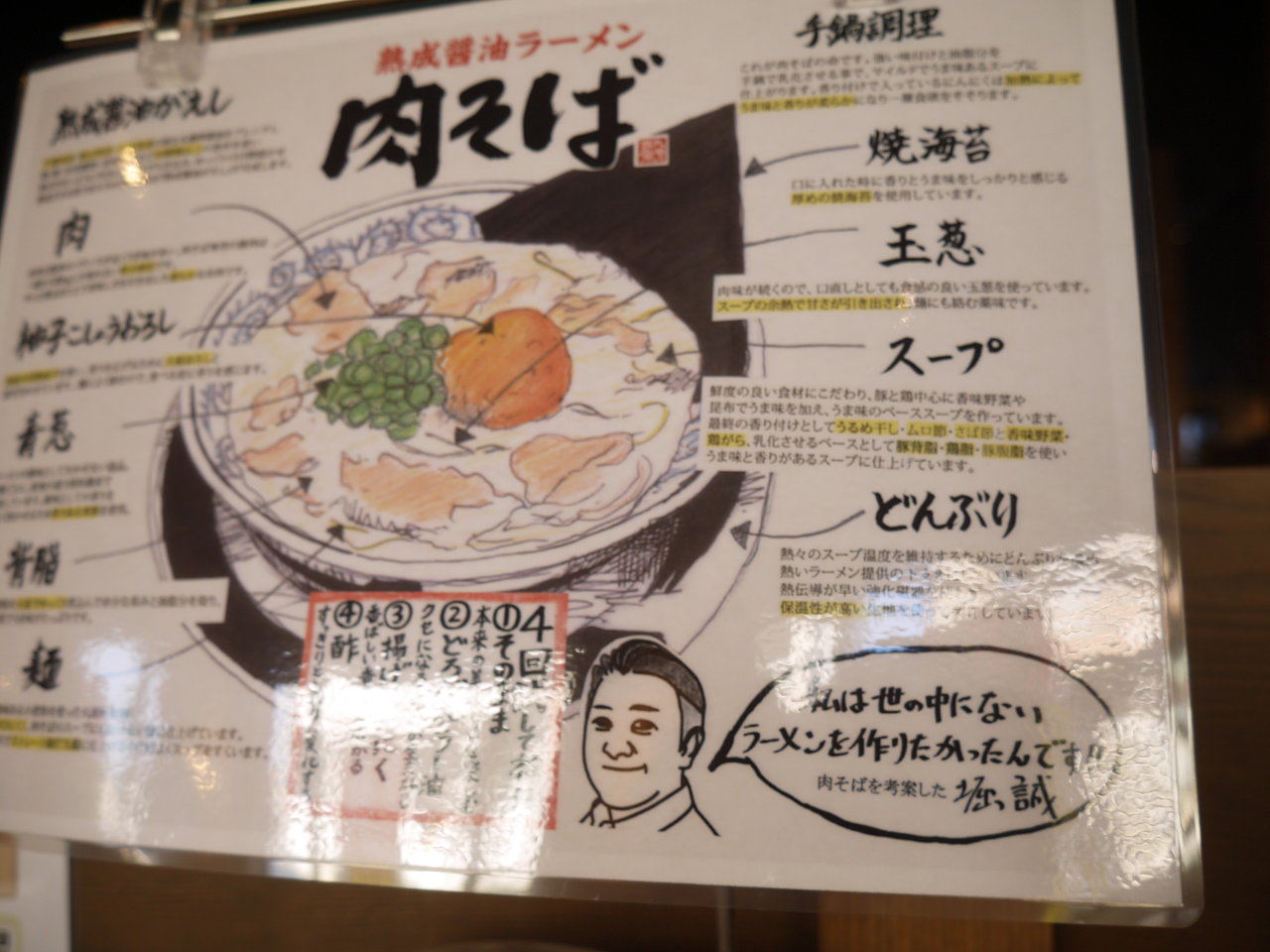 熟成醤油(小豆島産、千葉県産、岡山県産の本仕込み醤油の3種類をブレンドしたもの)や豚骨・鶏がらを煮込んだスープを使用した肉そばが名物になっていて、すっきりとした濃厚な風味が味わえるのだそうです。